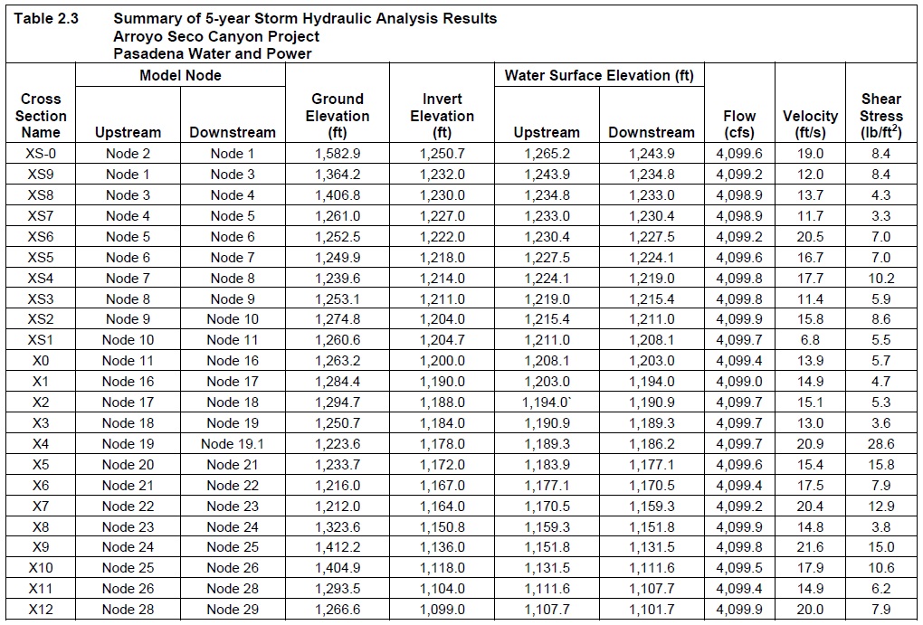 Table 2.3 Summary of 5-year Storm Hydraulic Analysis Results