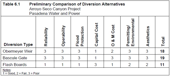 Table 6.1 Preliminary Comparison of Diversion Alternatives