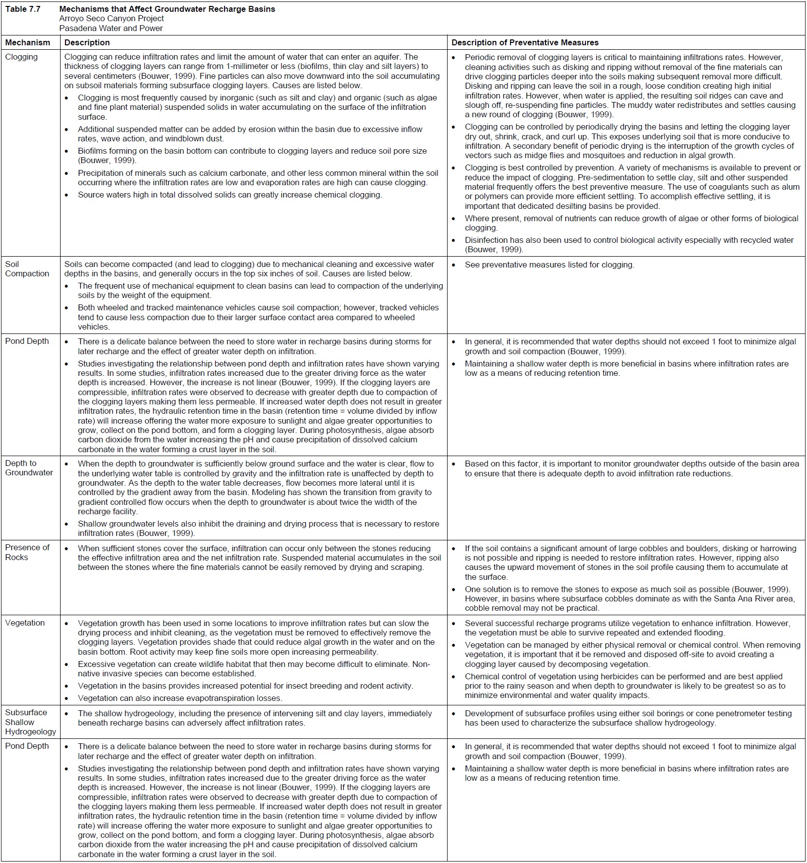 Table 7.7 Mechanisms that Affect Groundwater Recharge Basins