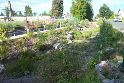 Rain falling on this Washington, DC road runs into a vegetated swale instead of a storm drain. The water soaks into the ground and recharges the aquifer.